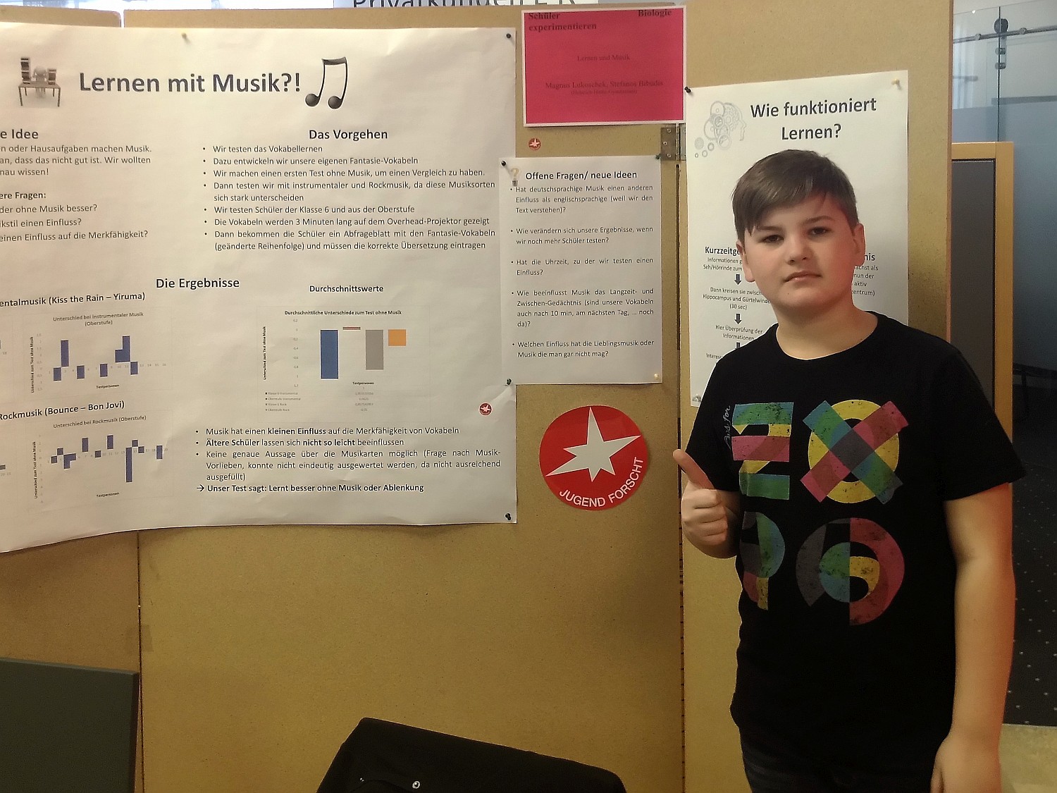 Magnus Lukoschek und Stefanos Bibudis (Betreuer Frau Marx) aus der 6s3 stellten sich in ihrem Projekt die Frage, ob man mit Musik besser lernen kann. Sie entwickelten Fantasie-Vokabeln, die ihre Testschüler (aus Klasse 6 und der Oberstufe) in 3 Minuten unter verschiedenen Bedingungen lernen mussten. Sie fanden heraus, dass man in der Oberstufe nicht mehr so leicht abzulenken ist, wie in Klasse 6. Hier verschlechterten sich die Probanden, wenn Musik beim Lernen lief. Die Jury lobte vor allem ihre empirische Vorgehensweise und dass sie ihre Ergebnisse kritisch hinterfragt haben. Aus der Arbeit ergaben sich für die Gruppe viele offene Fragen, die noch genauer untersucht und geklärt werden wollen. Für dieses wissenschaftliche Vorgehen kürte sie die Jury als Regionalsieger der Kategorie Biologie.
