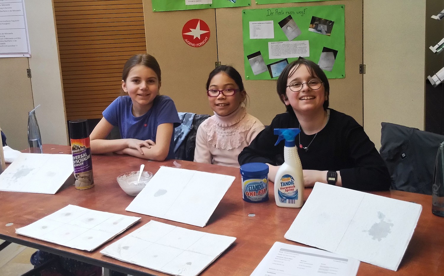 Merle Galm, Sofie-Lu Grimm und Ludwig Muckle (5h) verschrieben sich dieses Jahr der Fleckenentfernung. Sie suchten ein Mittel, mit dem man einen Rotweinfleck am besten von weißer Tapete entfernen kann. In der Auswahl waren neben Oxyreiniger und Activspray auch Haushaltsmittel wie Zitronensaft oder Salz. Das Rennen machte am Ende das Vorwaschspray von Tandil. Ihre Arbeit wurde mit dem 2. Platz im Bereich Chemie belohnt. Außerdem wurde Sofie mit ihren 8 Jahren als jüngste Teilnehmerin geehrt.