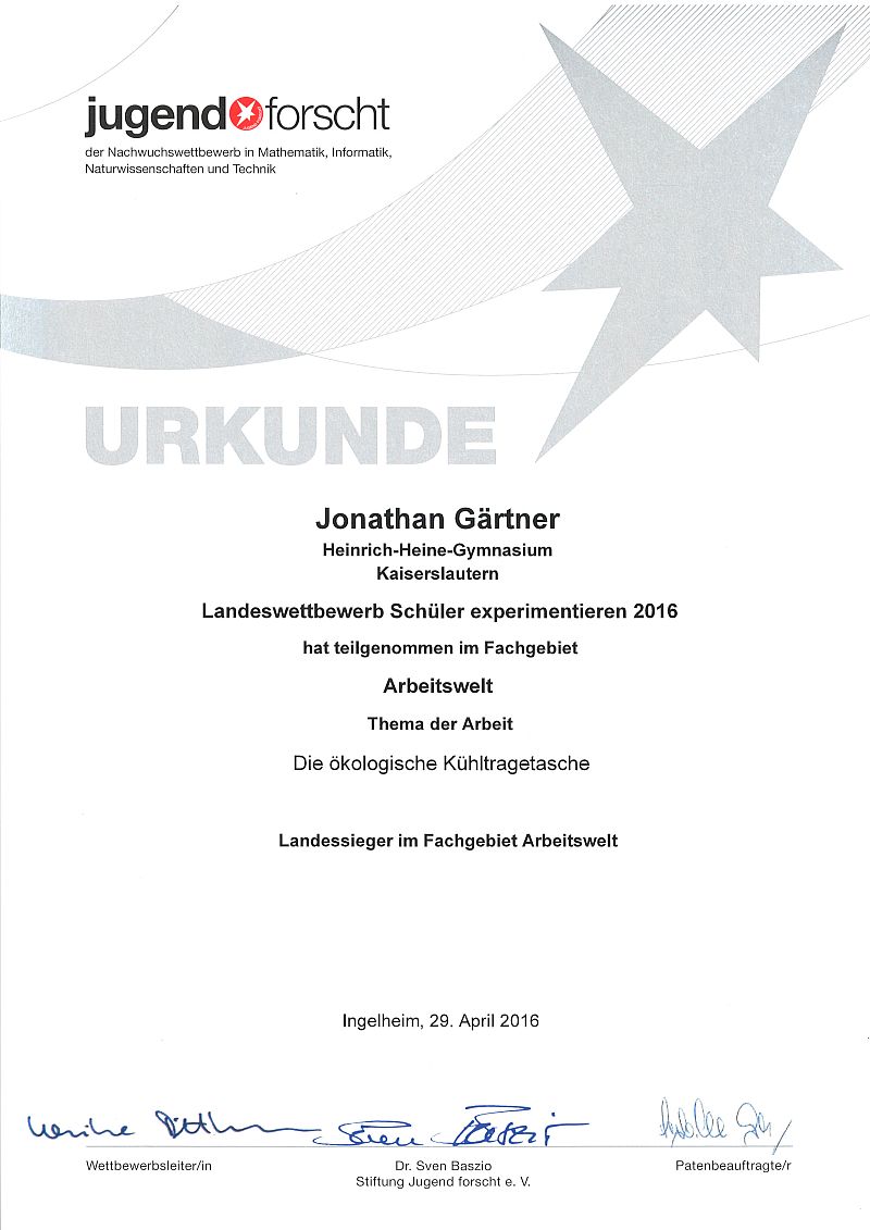„Landessieg!“ hieß es für Jonathan Gärtner (5h) und Jan Ole Köntopp (6h) im Fachgebiet Arbeitswelt. Die beiden gehörten zu den jüngsten Teilnehmern im Feld und konnten durch ihre ökologische Kühltragetasche alle überzeugen. „Wie man aus Hanf eine etwas andere Tüte drehen kann…“ begann die Laudatio der Jury. Als Isoliermaterial für ihre Kühltasche nutzten die beiden nämlich Hanfmatten, die mit einer Folie aus Maisstärke vor Feuchtigkeit geschützt wird. Das Erstaunliche ist, dass ihre Konstruktion die Kälte länger beim Gefriergut hält als herkömmliche Taschen aus dem Supermarkt. Die beiden Schüler hatten auch schon eine Idee, wie man die vollständig recycelbare Tasche vielleicht in einer Kleinserie herstellen könnte. Ihr erster Platz wurde neben Ruhm und Anerkennung mit einem Geldpreis von 150 Euro belohnt.