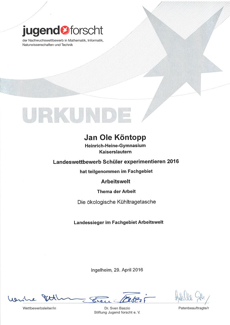 Am vergangenen Donnerstag und Freitag (28./29.04.2016) trafen sich nun zahlreiche rheinlandpfälzische Jungforscher in Ingelheim um ihre Ergebnisse in den verschiedenen Kategorien der Jury vorzustellen. Die Schüler erlebten ein ereignisreiches Wochenende mit verschiedensten Höhepunkten. Die größte Spannung war zu spüren als alle am Freitag in der Feierstunde gespannt auf die Ergebnisse warteten. Für unsere HHG-Schüler hatte sich das Warten gelohnt!