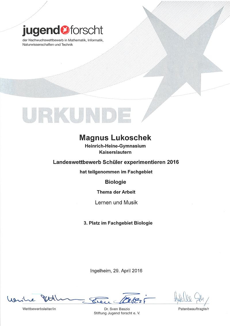 Auch Magnus Lukoschek und Stefanos Bibudis (6s3) stellten sich in einem Feld von insgesamt 11 Gruppen den überaus kritischen Fragen der Fachjury im Bereich Biologie. Sie hatten untersucht, ob man mit Musik besser eigens erfundene Vokabeln lernen kann als ohne. Auch die Einflüsse von Alter und Musikstil auf den Lernerfolg interessierten die beiden. Seit dem Regionalwettbewerb in Kaiserslautern hatte die Gruppe ihre Untersuchungsreihe erweitert und konnte nun der Jury ihre spannenden Erkenntnisse vorstellen. Ihre Ergebnisse münden in einer klaren Empfehlung: V.a. jüngere Schüler sollten besser ohne Musik lernen, da sie sich in den Test mit Musik im Schnitt um 20-30% verschlechterten. Besonders auffällig war die Verschlechterung bei allen Testpersonen bei dem Song „Auf uns“. Dieser mit fußballerischen Emotionen verbundene, deutsche Titel machte es den Probanden besonders schwer sich zu konzentrieren. Die wissenschaftliche Herangehensweise der beiden Forscher belohnte die Jury mit einem 3. Platz und einem Geldpreis von 75 Euro.