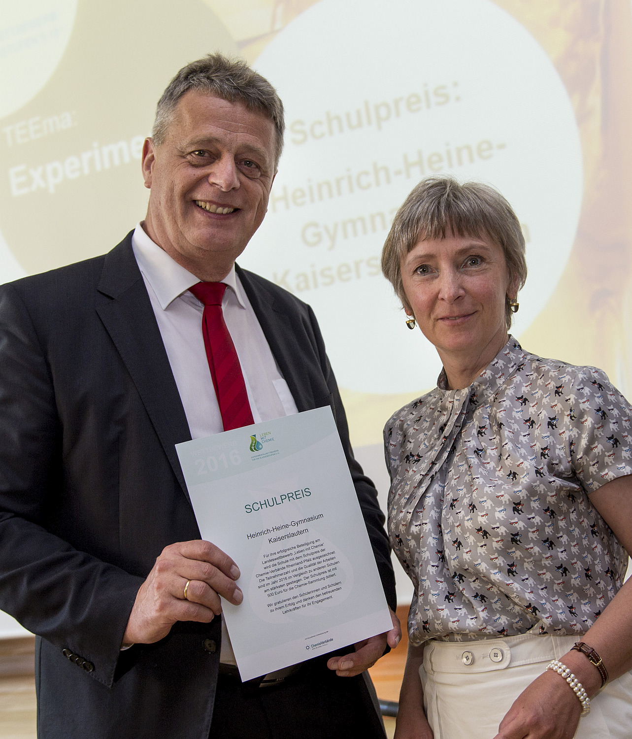 Gewinner 2016 ist das Heinrich-Heine-Gymnasium. Heute erhielt der Schulleiter Dr. Ulrich Becker den Schulpreis in Höhe von 500 Euro: „Ich freue mich, dass so viele Schüler mit Ihren Lehrern gemeinsam an einem interessanten Thema gearbeitet haben. Kreative Ideen und Fleiß zusammen haben zu diesem besonderen Erfolg auf Landesebene geführt. Hierauf bin ich sehr stolz und danke und gratuliere allen Beteiligten. Das Preisgeld ermöglicht uns weitere Arbeiten in der Chemie.“