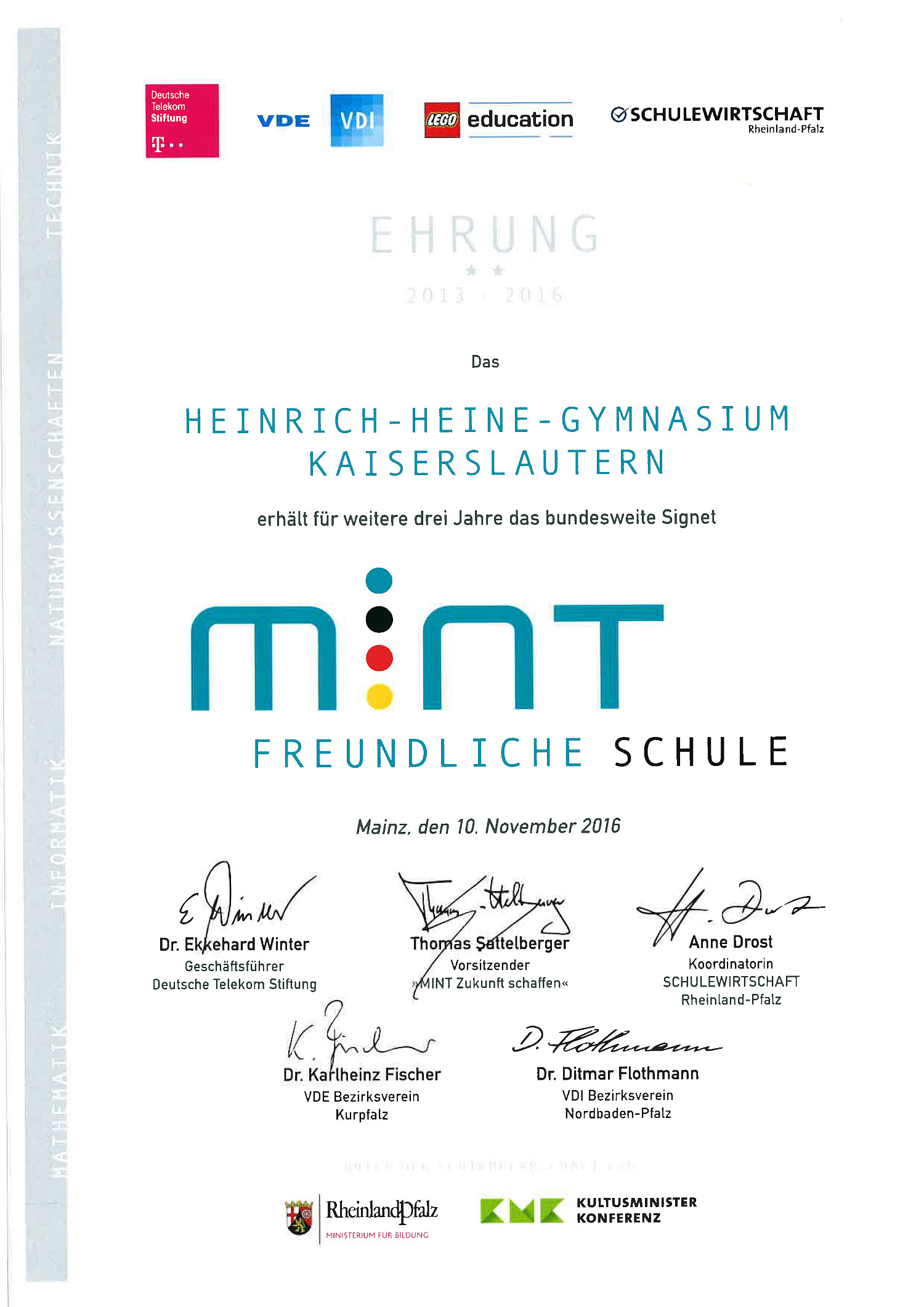 Das Heinrich-Heine-Gymnasium Kaiserslautern darf sich auch für die nächsten drei Jahre »MINT-freundliche Schule« nennen. Die Schule wird nach dreijähriger erfolgreicher MINT-Profilbildung erneut mit dem Signet »MINT-freundliche Schule« geehrt. Die Auszeichnung erfolgt aufgrund der MINT-Schwerpunktsetzung (Mathematik, Informatik, Naturwissenschaften und Technik). Die Ehrung der Schulen in Rheinland-Pfalz steht unter der Schirmherrschaft der rheinland-pfälzischen Bildungsministerin Dr. Stefanie Hubig sowie der Kultusministerkonferenz (KMK).