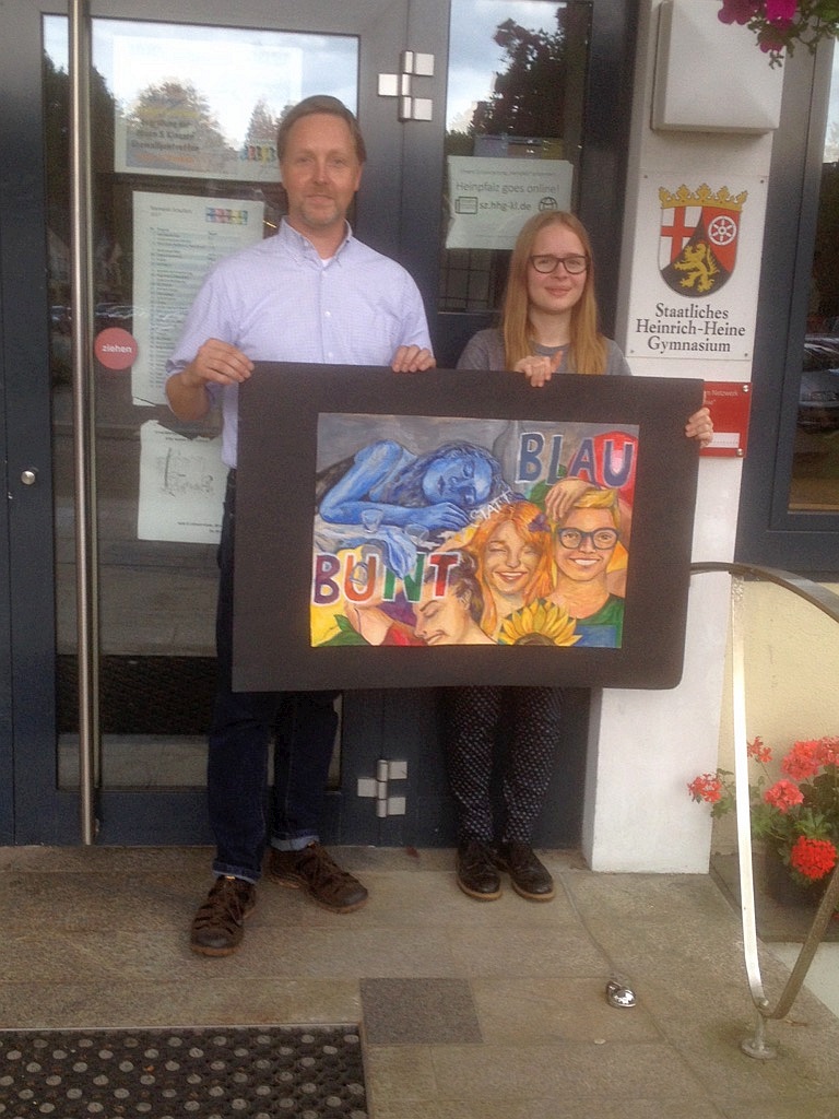 Einen tollen Erfolg konnte Tabea Reif, Schülerin der MSS 11 des Heinrich-Heine-Gymnasiums Kaiserslautern, verbuchen: Beim Alkoholpräventions-Wettbewerb „Bunt statt Blau“ der DAK wurde sie mit ihrem Bild Landessiegerin Rheinland-Pfalz und Bundesfinalistin. Herr Schott, Suchtpräventionsbeauftragter am HHG und Betreuer des Wettbewerbs: „Das ist ein toller Erfolg für Tabea und für unsere Schulgemeinschaft. Es zeigt, wie engagiert wir hier am HHG Drogen mit Freude und Kreativität entgegentreten.“