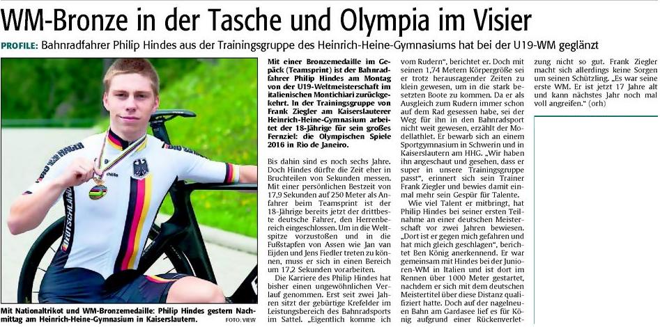 Mit einer Bronzemedaille im Gepäck (Teamsprint) ist der Bahnradfahrer Philip Hindes am Montag von der U19-Weltmeisterschaft im italienischen Montichiari zurückgekehrt. In der Trainingsgruppe von Frank Ziegler am Kaiserslauterer Heinrich-Heine-Gymnasium arbeitet der 18-Jährige für sein großes Fernziel: die Olympischen Spiele 2016 in Rio de Janeiro.
