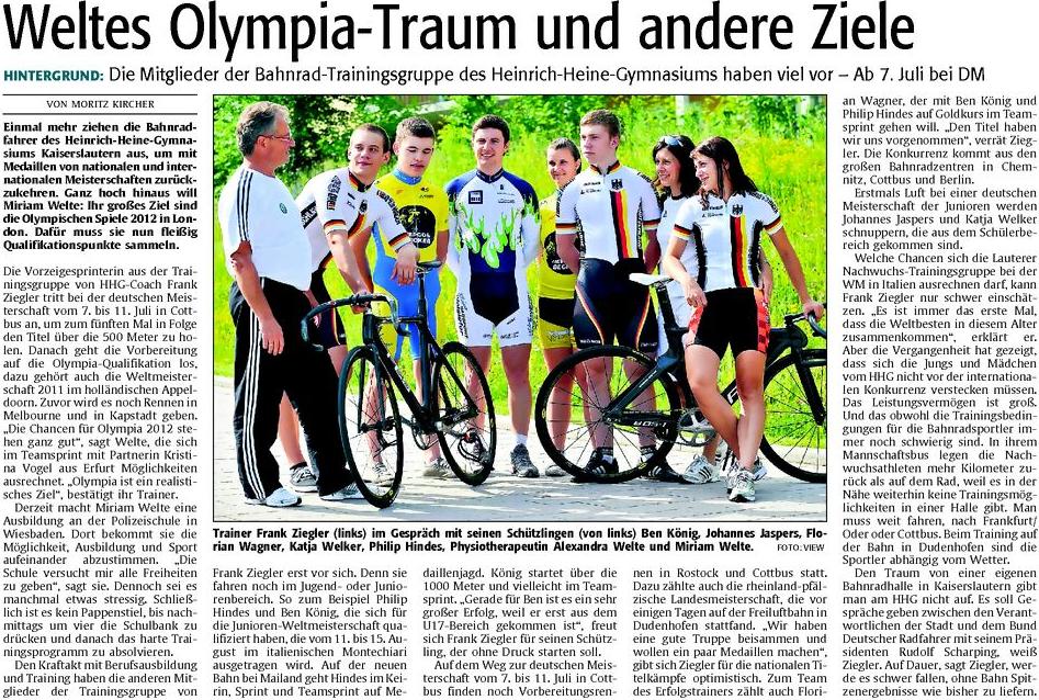Einmal mehr ziehen die Bahnradfahrer des Heinrich-Heine-Gymnasiums Kaiserslautern aus, um mit Medaillen von nationalen und internationalen Meisterschaften zurückzukehren. Ganz hoch hinaus will Miriam Welte: Ihr großes Ziel sind die Olympischen Spiele 2012 in London. Dafür muss sie nun fleißig Qualifikationspunkte sammeln.