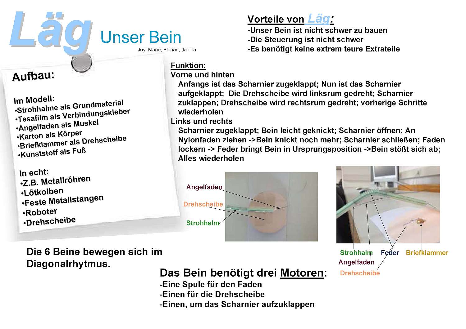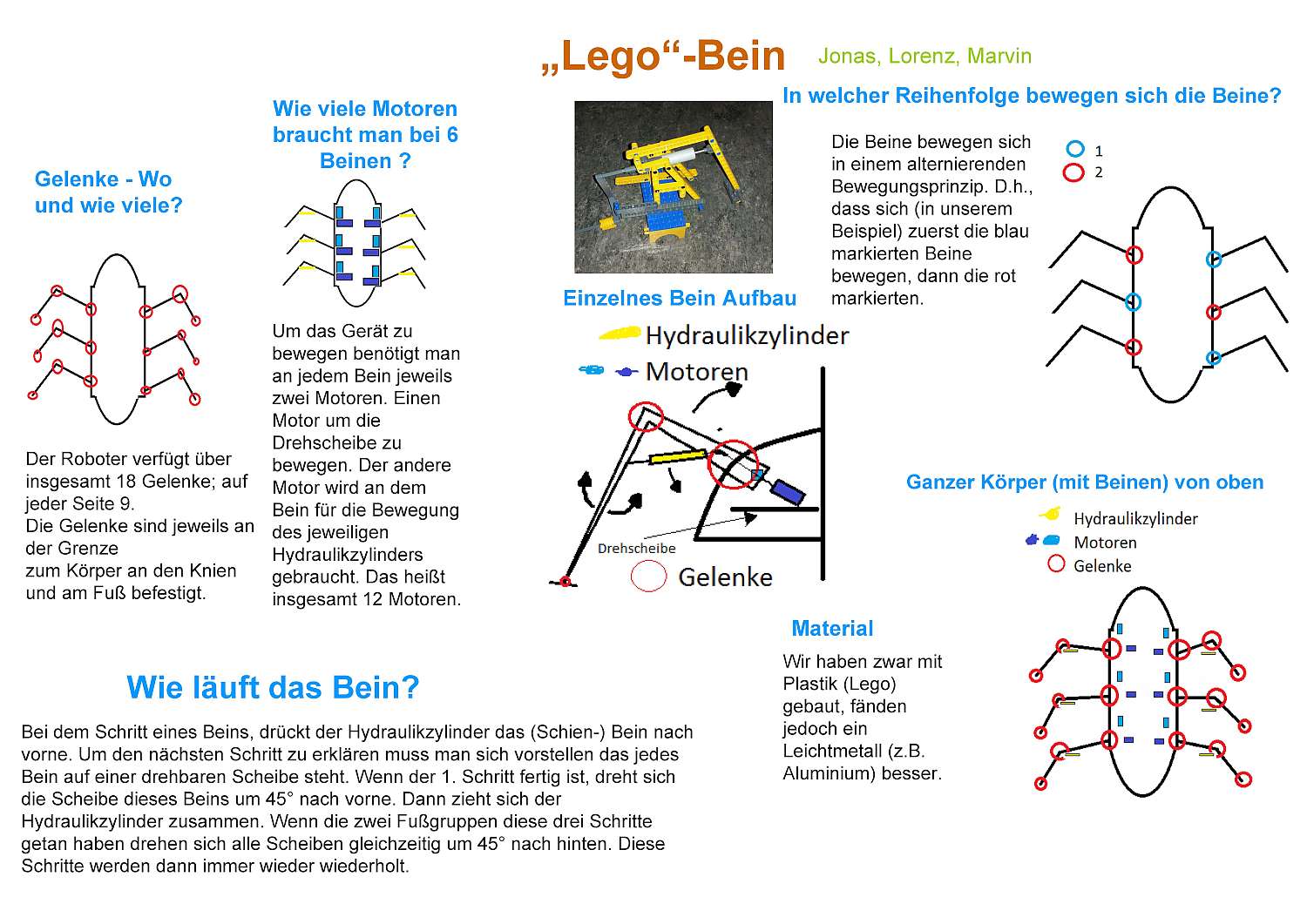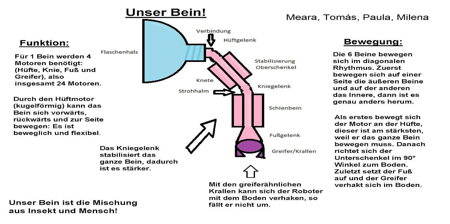 Der erste Schritt auf dem Weg zum Roboter sind die Beine. Sie sollen möglichst gut auf jedem Untergrund Halt finden. Dazu haben wir uns zunächst verschiedene Beintypen aus dem Tierreich näher angeschaut. Anschließend haben wir Vor- und Nachteile abgewogen und eine erste Grundlage für Prototypen gefunden. Die daraus erbauten Modelle haben wir mit einfachen Materialien erstellt und auf Plakaten unseren Mitschülern präsentiert. Jetzt versuchen wir aus allen Ideen das Beste herauszufiltern und ein erstes bewegliches Modellbein zu bauen.